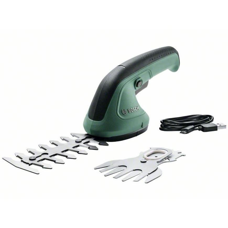 Súprava akumulátorových nožníc na kríky a na trávu EasyShear; Jednoduché, ľahké zastrihávanie kríkov aj okrajov trávnika; Dva v jednom: na zastrihávanie kríkov a trávy; Výmena nožov bez nástrojov a bez problémov; Užívajte si slobodu bez káblov a skvelú manévrovateľnosť po celej záhrade; Nízka hmotnosť 530 g a kompaktný dizajn uľahčujú ukladanie a zaisťujú okamžitú pripravenosť na použitie; Integrovaný lítium-iónový akumulátor 3,6 V pre optimálnu výkonnosť; Mikro USB kábel; Nôž na kríky, 120 mm (F 016 800 588); Nôž na trávu, 100 mm