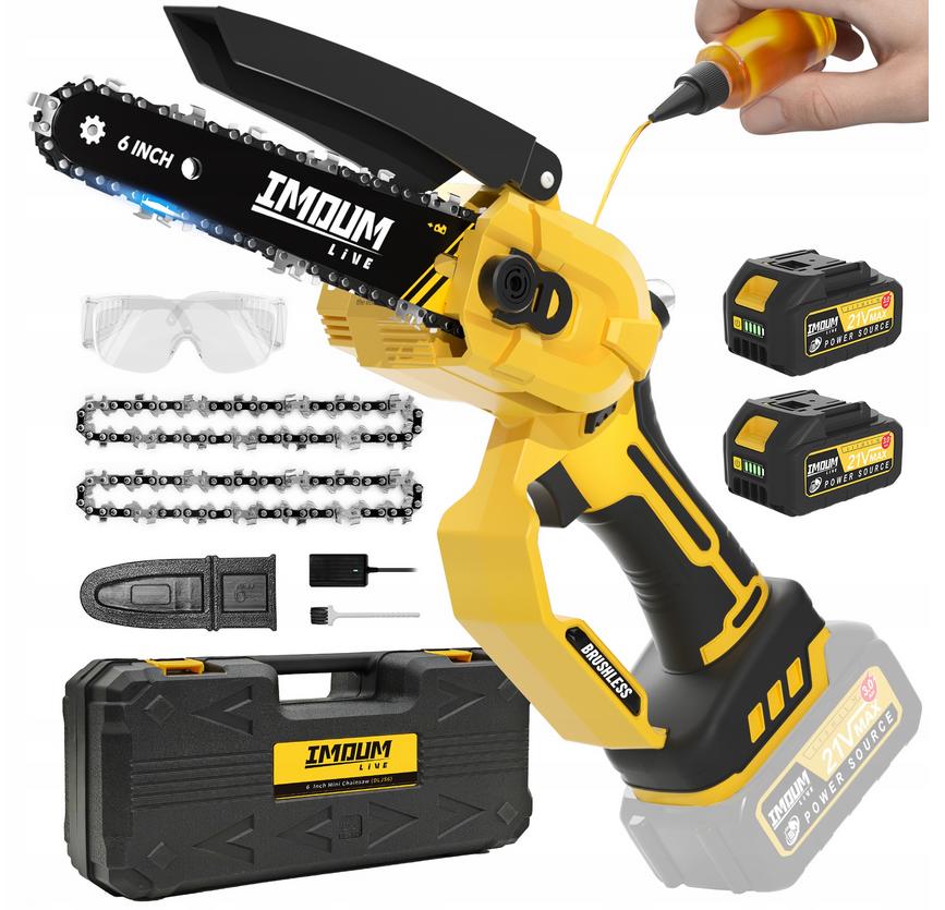 Výbava: 2x akumulátor, nabíjačka, skrutkovač, 2x reťaz, vedenie reťaze, chránič reťaze, chránič ruky, brúska na reťaz, čistiaca kefka, lievik na olej, ochranné okuliare, návod na použitie, kufrík