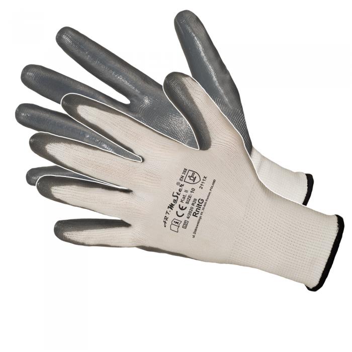 Ochranné rukavice, vyrobené z bieleho polyesterového úpletu, potiahnuté šedým nitrilom, bezšvové, zakončené lemom.