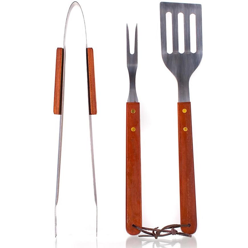 3 dielna súprava grilovacieho náčinia obsahuje kliešte, obracačku a vidličku z nerezovej ocele. Rukoväť je z dreva. Súprava obsahuje základné náradie potrebné pri grilovaní. Náradie je vybavené pútkami pre zavesenie.