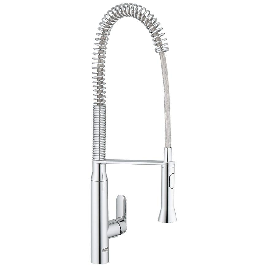 Štýlová kuchynská batéria GROHE K7 poskytuje profesionálnu funkcionalitu, napríklad vyťahovaciu sprchu, ktorú je možné otáčať v rozsahu plných 360° a ktorá ponúka možnosť prepínania medzi jemným a silným prúdom. Vďaka svojmu širokému dosahu a vysokému výpustu bude naplňovania či vyplachovanie hrncov, prípadne čistenie pracovnej plochy, jednoduchšie než kedykoľvek predtým. Aby bolo zaistené extra hladké a jednoduché ovládanie, je táto páková batéria vybavená technológiou GROHE SilkMove. Žiarivá chrómová povrchová úprava GROHE StarLight si navyše zachová svoj žiarivý lesk aj po mnohých rokoch intenzívneho používania. Náš jednoduchý inštalačný systém zaručuje extra rýchlu inštaláciu tejto batérie. K7 – fantastický profesionálny pomocník do vašej kuchyne. 1-otvorová montáž GROHE StarLight povrch, keramická kartuša s technológiou GROHE SilkMove 35 mm, profesionálny hlavica, prepínanie: perlátor/SpeedClean sprška, automatické spätné prepínanie na perlátor, kovová sprcha, variabilne nastaviteľný obmedzovač prietoku, otočný výtok, otočný uhol 140°, zaistené proti spätnému toku, flexi prípojné hadičky, rýchlomontážny systém, Minimálny odporúčaný tlak 1,0 baru