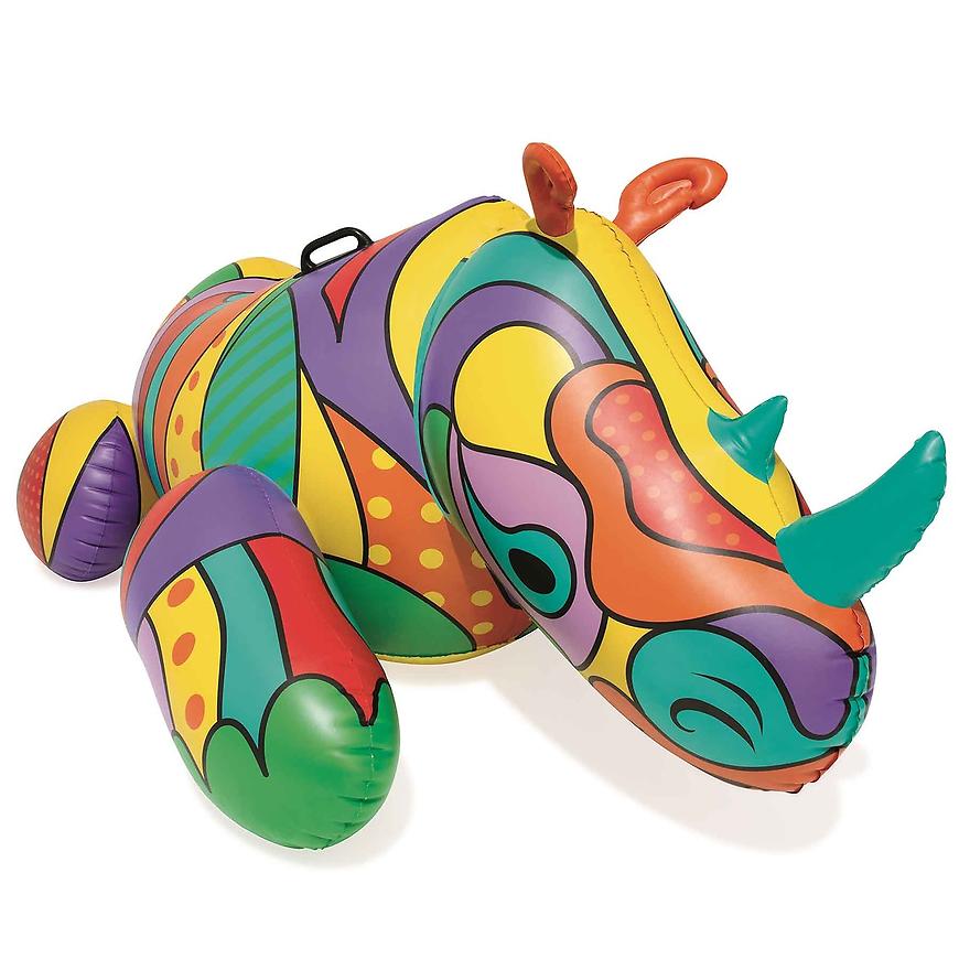 Veľká lehátko na plávanie farebný nosorožec v štýle pop art. Bezpečné rukoväte a žiarivé farby na slnku zaručujú bezpečnosť a istotu, že vaše dieťa bude stále viditeľné medzi davom na pláži. Vďaka väčšej veľkosti si môžu na vodnej hračke zaplávať aj staršie deti a dospelí. Pomáha zvyknúť si na vodu tým, že hrá v bazéne alebo vo vodnom útvare. Výrobca vybavil lehátko až 6 provzdušňovacích komôr a náplasťami na opravu, čo znamená, že nejde o jednorázový nákup, ale o investíciu v niekoľko rokov.