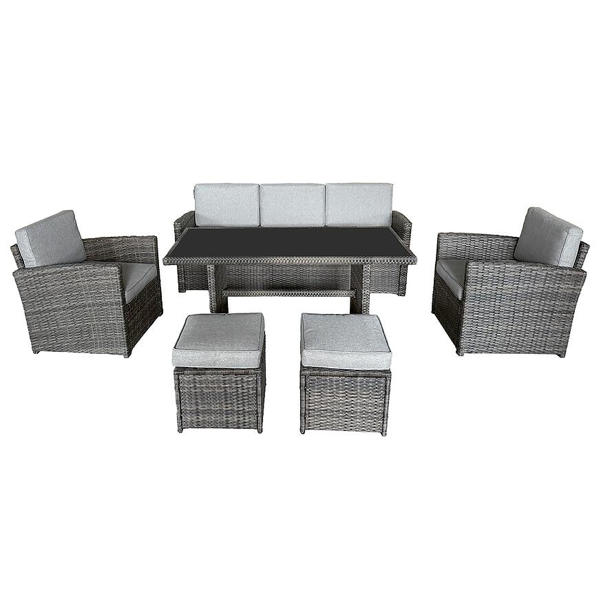 Napoli je veľký technoratanový set, na ktorom môžete stolovať. Veľký stôl so zosilnenými nohami zaručuje, že si každý nájde miesto pre seba. Set je vhodný aj na odpočinok, dve taburetky môžu byť použité ako opierky nôh počas popoludňajšieho leňošenia s vašou obľúbenou knihou alebo ako taburetka pre najmenších. Súprava je vybavená hrubými vankúšmi o hrúbke 8cm na operadle a sedačke, preto je set veľmi vhodný ako na relax, tak aj na rodinnú večeru. Textúra technoratanu dáva celému setu štýl, eleganciu a robí ju vhodnou pre akúkoľvek terasu alebo záhradu. Pohovka, kreslá a stoličky môžu pojať až 7 osôb, preto je Napoli nepochybne rodinnou súpravou. Pozoruhodná je skutočnosť, že stolové sklo je tvrdené, a celý rám setu kovový preto je to sada na mnoho sezón.