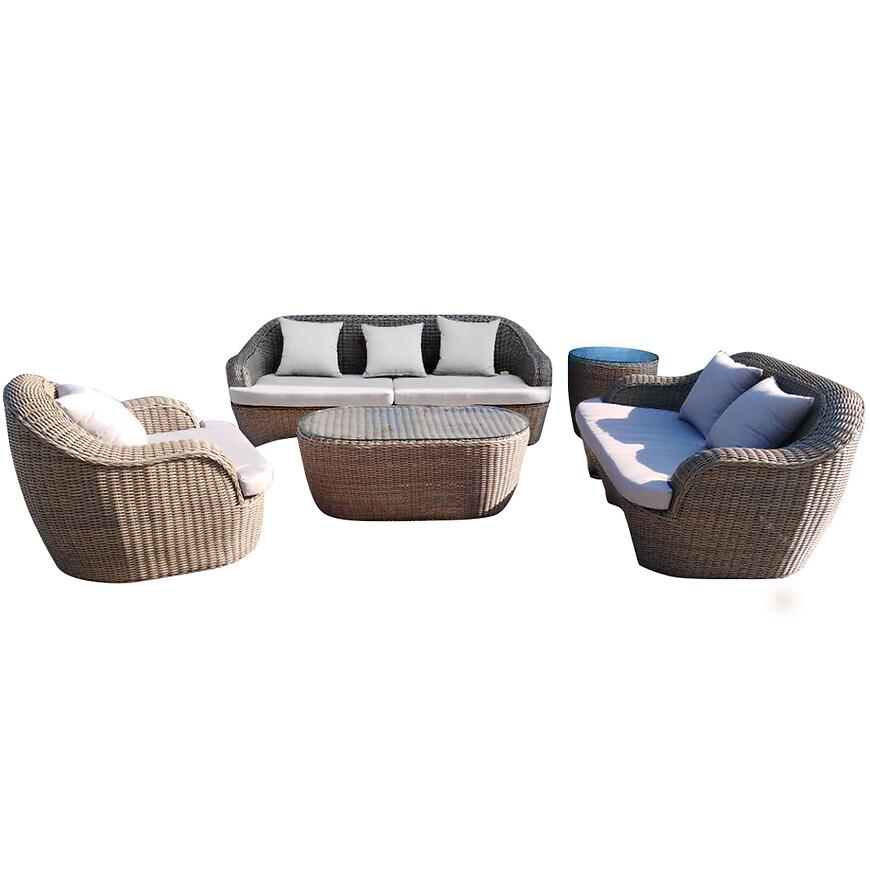 Masívny záhradný set pre veľké terasy a záhrady. Precízne spracovanie a elegancia sú hlavné prednosti tohto setu. Veľké, hrubé vankúše, široké a ľahké lakťové opierky, samostatné stolíky zaručia maximálne pohodlie a komfort až pre 6 osôb. Sklenené dosky stolov sú upevnené niekoľkými prísavkami, takže nemusíte mať strach zo skĺznutia. Celej sade dodáva charakter plocho pletený technoratan a široké ukončeia na okrajoch každej časti. Napriek svojim rozmerom je súprava veľmi ľahká vďaka hliníkovej konštrukcii, ktorá navyše umožní používanie v každom ročnom období. Elegancia a funkčnosťspôsobia, že každý si tento nábytok všimne. Dva samostatné stolíky štvorcový a okrúhlý sú veľmi funkčné a môžno ich rúzne rozostaviť, podľa potrieb. Sada je sa predáva montovaná, nie je potrebná samostatná motáž, stačí ju vybrať z obalu a ľubovoľne usporiadať. Veľmi ľahko sa čistí, stačí utrieť vlhkou handričkou.