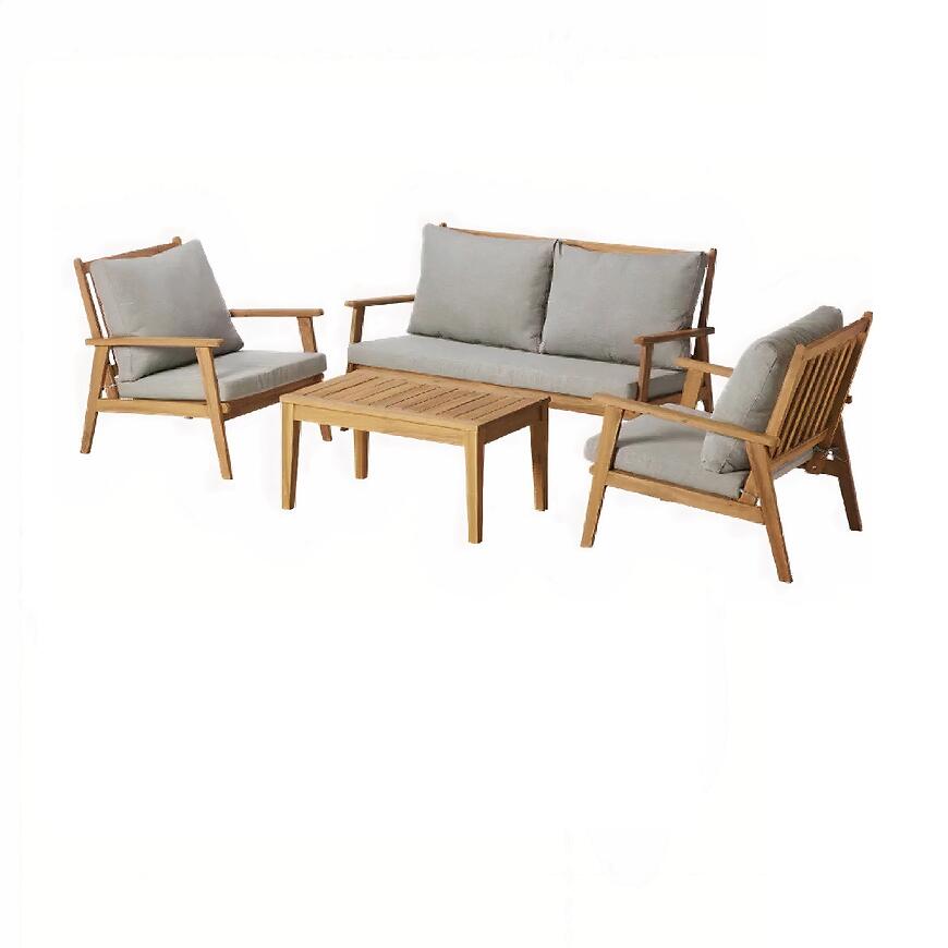 Tento elegantný drevený záhradný set je ideálnou voľbou pre tých, ktorí si cenia prírodné materiály a pohodlie. Set obsahuje priestrannú pohovku, dve pohodlné kreslá a praktický stolík, ktorý sa dokonale hodí na letné stretnutia na čerstvom vzduchu. Sivé vankúše pridávajú na štýle a zabezpečujú komfort, dokonale ladia s drevenou konštrukciou nábytku.