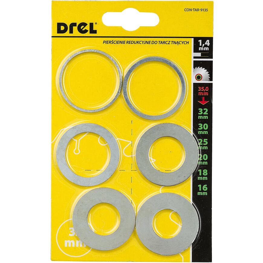 Redukčný krúžok pre pílové kotúče, 35/32 mm, 35/30 mm, 35/25 mm, 35/20 mm, 35/18 mm, 35/16 mm, hrúbka 1,4 mm, súprava 6 ks, Drel