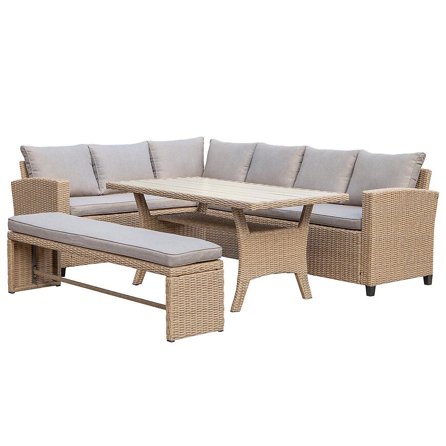 Sada Stockholm Natural je zaujímavou ponukou pre všetkých, ktorí hľadajú rohový jedálenský set z technoratanu s vysokým jedálenským stolom do svojej záhrady. Je to set, ktorý vám umožní vychutnať si chutné jedlá a príjemnú spoločnosť na čerstvom vzduchu. Rohový set je vybavený mäkkými vankúšmi na sedadlách a operadlách. Set sa skladá z jedálenského stola s rozmermi 144 x 74 x 67 cm a jeho doska je vyrobená z odolného polywoodu (syntetický materiál, ktorý imituje drevené dosky), takže je ľahký na údržbu a odolný proti poškriabaniu. Stôl má ideálnu výšku, ktorá zabezpečuje pohodlnú polohu počas konzumácie jedál v kruhu rodiny a priateľov. Set je určený pre 9 osôb a poskytuje im komfort a priestor. Rohový set Stockholm Natural s vysokým jedálenským stolom je nábytok, ktorý dodá vašej záhrade štýl a triedu. Objednajte si ho ešte dnes a užívajte si krásnu a funkčnú záhradu alebo terasu!