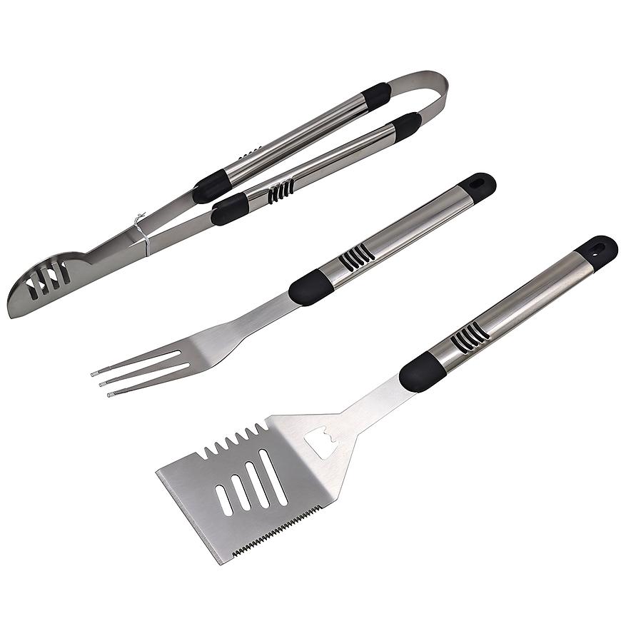 Súprava grilovacieho náradia obsahuje kliešte, vidličku a obracačku, ktoré vám pomôžu pripraviť jedlo na grile a zároveň zaistia bezpečnosť a pohodlie.