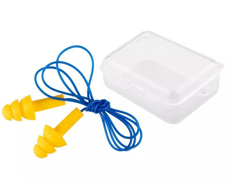 Štuple do uší na šnúrke od značky NEO, ponúkané s praktickým plastovým úložným boxom.