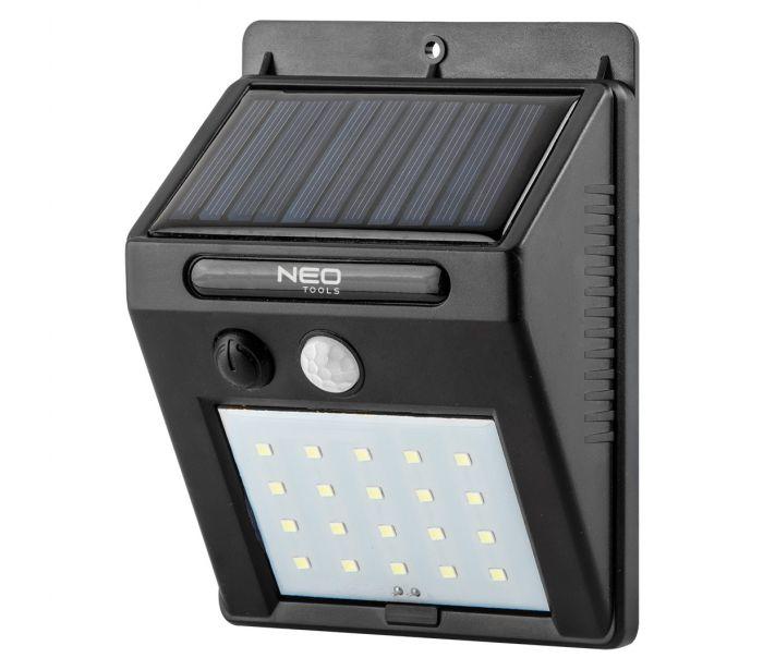 Solárne nástenné svietidlo 20 SMD LED, 99-055, NEO, sa používa na osvetlenie príjazdových ciest, terás alebo domových vchodov. Hlavnou výhodou reflektora je automatický štart, vďaka inštalácii pohybového senzora. Senzor je umiestnený pod tienidlom. Dá sa nasmerovať horizontálne aj vertikálne. Maximálny dosah rozpoznania pohybu je 120º, maximálne do 10 m. Okrem toho môže svietidlo svietiť nepretržite so 100 alebo 50 %.