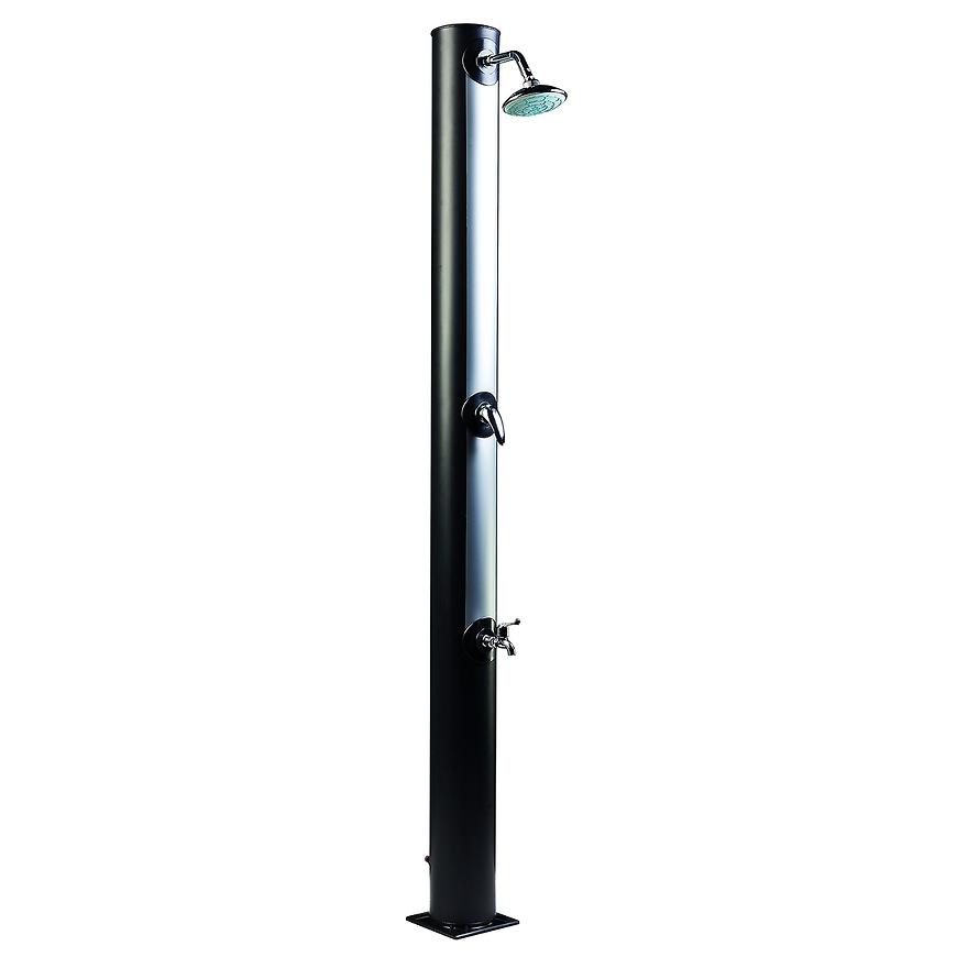 Záhradná sprcha UNO s nezvyčajným objemom 35 l pre vonkajšie použitie. Zaistí ohrev vody privádzanej zo záhradnej hadice a tým perfektný pocit pohodlia pri sprchovaní teplou alebo vlažnou vodou. Ohrev vody zabezpečuje slnečné žiarenie a telo sprchy, ktoré funguje ako solárny kolektor. Pre sprchovanie musí byť záhradná sprcha stále napojená na vodovodný rozvod. Ak nie je napojená, nie je možné sa sprchovať. Sprcha je navyše vybavená samostatným kohútikom vo výške kolien pre opláchnutie nôh alebo menších detí. Horná sprchovacia hlavica je vybavená kĺbom a možno ju tak polohovať do rôznych smerov. Sprcha sa kotví pomocou 4 skrutiek (nie sú súčasťou balenia) pevne k zemi, čím je zabezpečená jej perfektná stabilita.