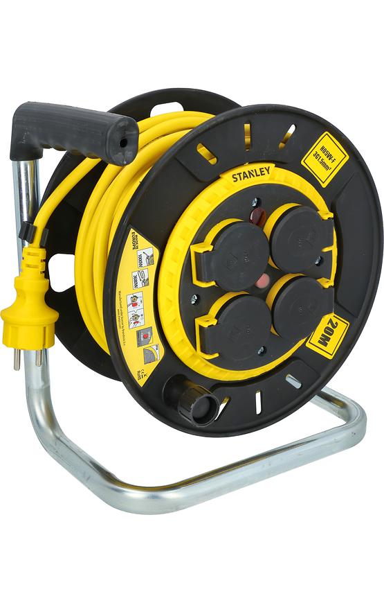 Predlžovací kábel STANLEY 20 m na bubne s uzemnením 16 A. Navijak so zámkom otáčania. Vypínač preťaženia. Pohodlná rukoväť. 4 zásuvky s klapkami. Trieda ochrany IP44 (ochrana proti striekajúcej vode z akéhokoľvek smeru a pevným predmetom s priemerom od 1 mm). Kábel 3×1,5 mm2. Vodič pokrytý hrubou vrstvou gumy. Maximálny príkon predlžovacieho kábla v rozvinutom stave je 3000 W a v navinutom stave 1000 W.