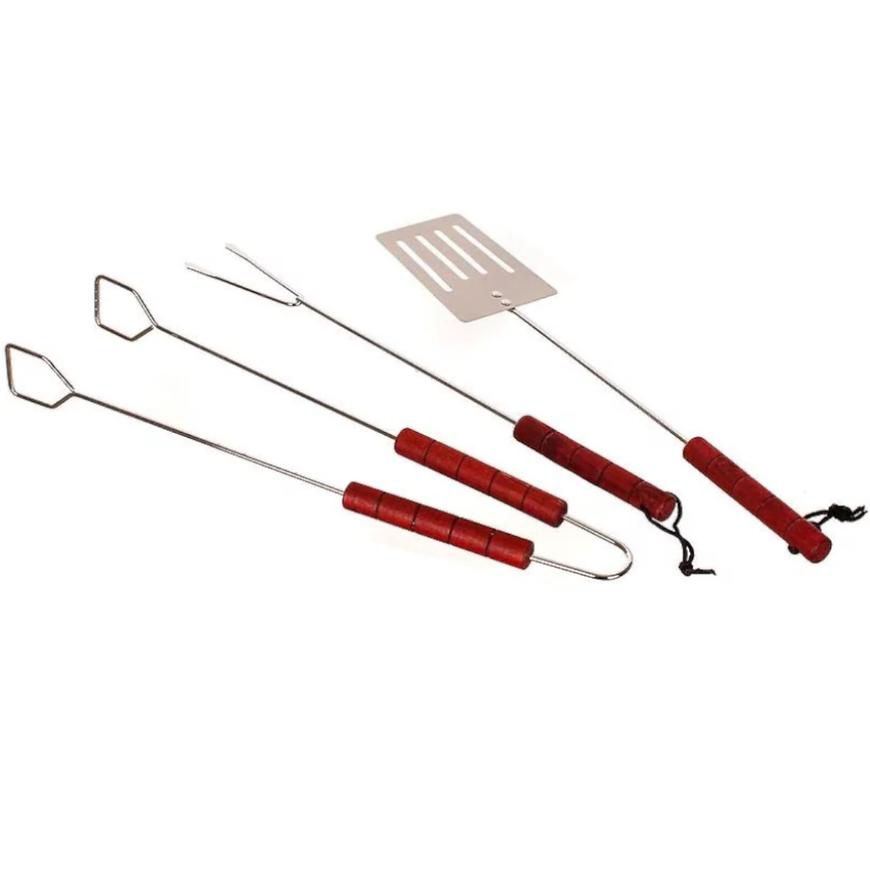 3 dielna sada grilovacieho náčinia obsahuje kliešte, obracačku a vidličku z pochrómovanej ocele. Rukoväť je z dreva. Sada obsahuje základné náradie potrebné pri grilovaní. Náradie je vybavené pútkami na zavesenie.
