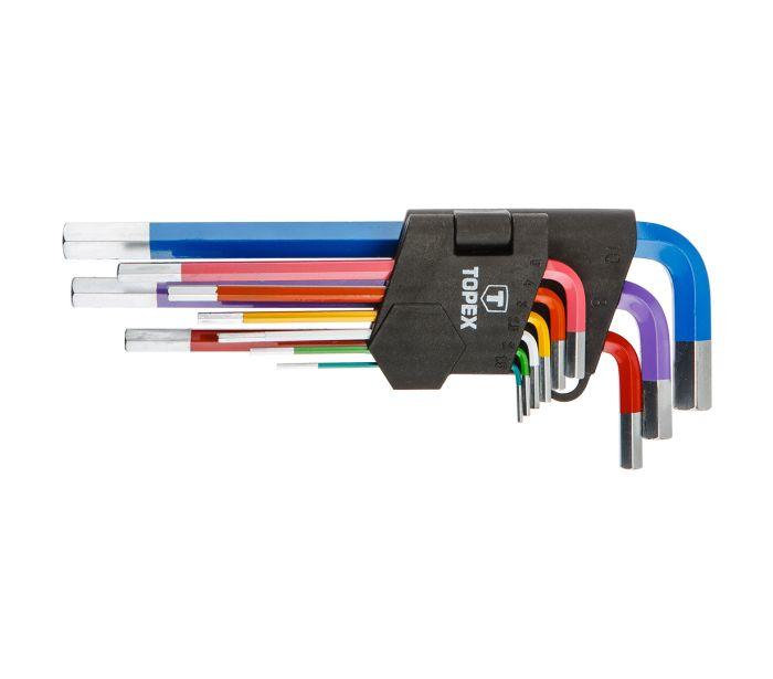 Súprava šesťhranných kľúčov TOPEX (ref. č. 35D966) obsahuje 9 kľúčov vo veľkostiach od 1,5 do 10 mm vyrobených z odolnej chróm-vanádiovej ocele. Každá veľkosť kľúča je označená inou farbou, čo uľahčuje rýchly výber správnej veľkosti pri práci. Všetko zabalené v praktickom balení. Značka TOPEX je zameraná na domácich majstrov.