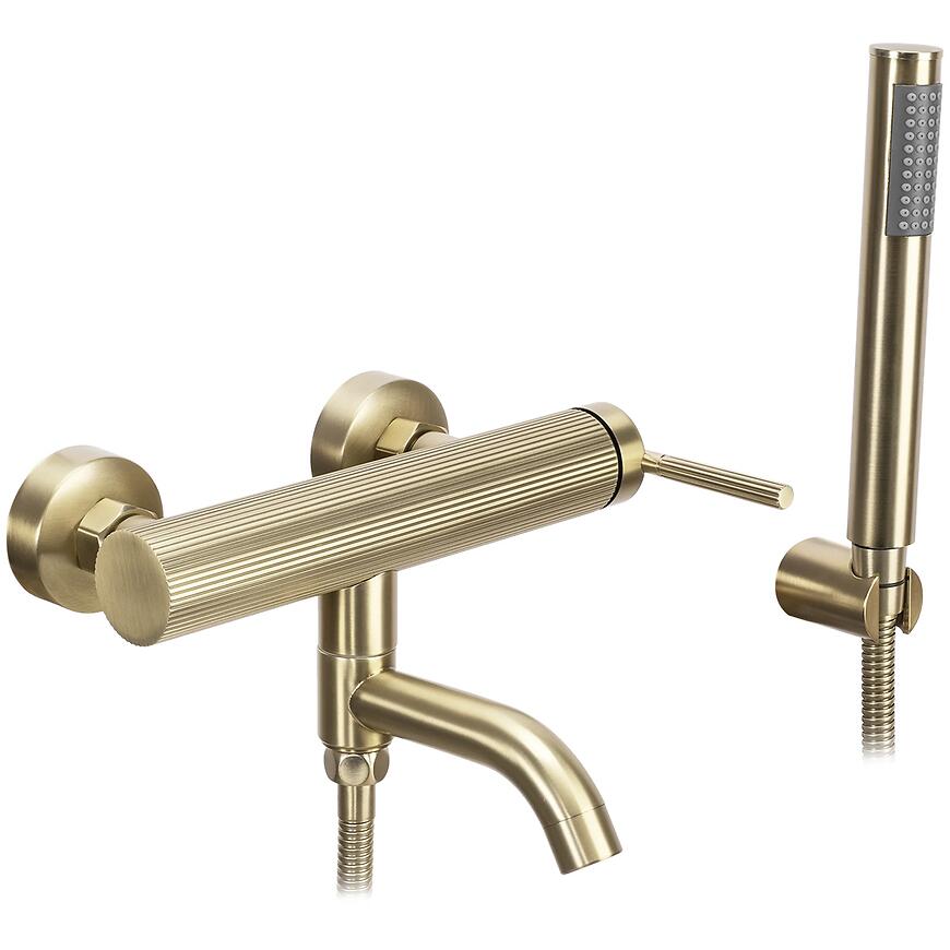 Predstavujeme vám krásnu, mimoriadne funkčnú a modernú vaňovú batériu s pohyblivým, sklápacím výtokom. Originálny, ryhovaný telo batérie jej dodáva moderný a zároveň elegantný vzhľad. Batéria je prispôsobená na montáž na stenu. Bola vyrobená z mosadze pokrytej trojitou matnou zlatou vrstvou. Vďaka špeciálnemu výrobnému procesu je trvácna a ľahká na údržbu. Zlatá brúsená povrchová úprava a moderný vzhľad zabezpečujú, že batéria bude nielen funkčným, ale aj estetickým prvkom vo vašej kúpeľni.