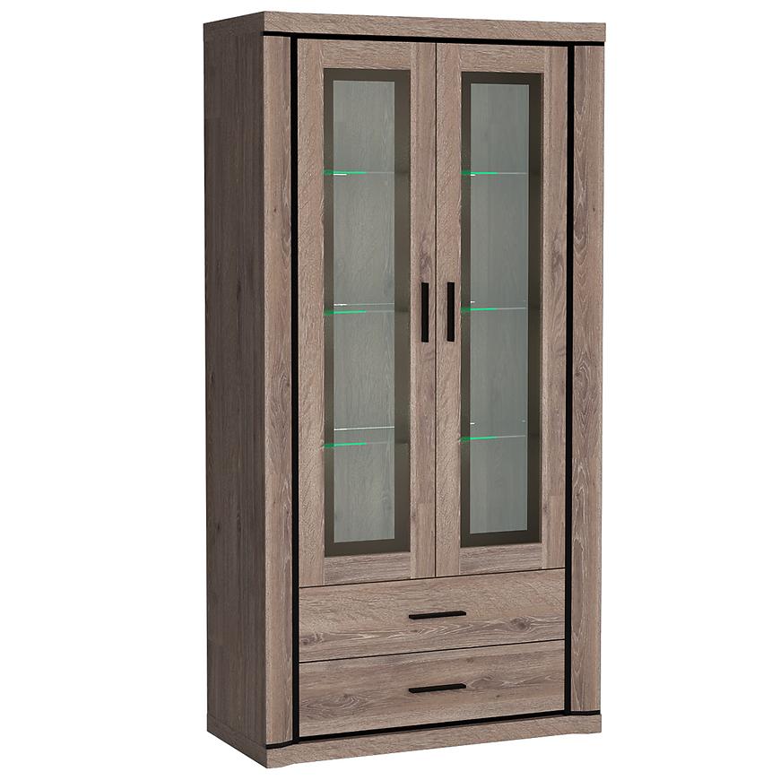 Vitrína vďaka svojmu jednoduchému dizajnu a širokej škále farieb ľahko zapadne do každej miestnosti a dodá jej eleganciu a charakter. Laminátové dosky s hrúbkou 48 mm sú skvelou voľbou na zabezpečenie vašej vitríny. Vo vnútri nájdeme tri krásne sklenené poličky, na ktorých dokonale vystavíme naše predmety. Dve zásuvky sú rovnako funkčné. Vitrína má krásne a originálne okraje v podobe čiernych líšt a kovových úchytiek, ktoré vyzerajú úžasne a upútajú pozornosť. Dostupné v dvoch farbách.