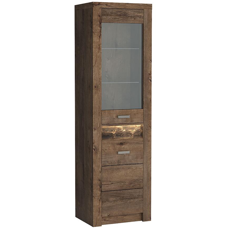 Vysoká vitrína s dvomi sklenenými policami a v spodnej časti skrinka s jednou policou. Na výber máme presklené a plné predné plochy. Nechýba ani možnosť osvetlenia v podobe LED stolovej dosky a políc. Ďalšie možnosti obohatia interiér. Zmestí sa do nej množstvo oblečenia, doplnkov, kníh či dokumentov. Vitrína je ideálna na vystavenie ozdôb, porcelánu alebo suvenírov. Dostupné v troch farbách.
